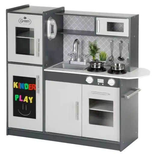 Kuchnia w nowoczesnym stylu z serii Green to propozycja ciekawej i wciągającej zabawy dla dzieci, które chętnie naśladują zajęcia dorosłych i w bezpieczny sposób mogą bawić się w małych kucharzy. Otwierane szafeczki, pełny węzeł AGD z dwupalnikową kuchnią i zlewozmywakiem s realistycznym kranem doskonale nadaje się do zabawy w gronie małych przyjaciółek